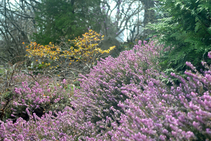 A number of evergreen species are grouped here, all of which prefer acidic soils. Their spring flowers appear in succession, with the heath coming first, in March.