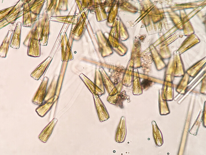 Not all microbes are able to float or swim. Some need some kind of surface to live on, just like we do. Surfaces underwater are hotbeds of microbial diversity. For example, the submerged rocks in the Shelby White and Leon Levy Water Garden are covered with a slick brown coating. This coating is teeming with microbes. The slimy substance forms when many unicellular algae, called diatoms, grow together into large communities. Some of the diatoms form long filaments with cells stacked end to end. When many of these filaments cluster together, they form the fine brown threads you can see dangling off the rocks.