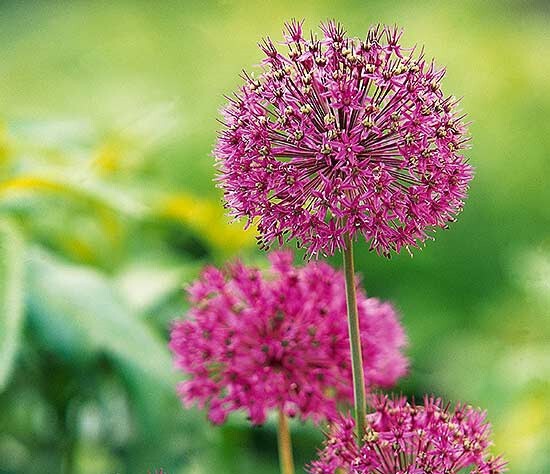 Plant allium bulbs in the fall as you would any other bulb. Don't be alarmed when they don't bloom right away: They're early summer-flowering plants. Alliums should be planted in part to full sun in well-draining soil. Allow foliage to die down before trimming. These plants usually naturalize easily and will return bigger and more vibrant each year. The allium is hardy, too–deer resistant and tolerant to drought.