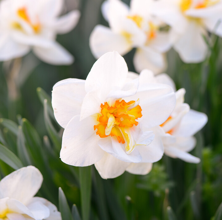 Like regular daffodils, double varieties can bloom in bright, sunny yellow, pure white, blush pink, or light orange. Most will grow between 1 and 3 feet tall. One of the most popular varieties, ‘Tahiti’, has bright yellow petals with a few smaller orange petals near the center. The effect is almost like a tropical sunrise in your garden. ‘Tahiti’ has also won multiple awards, including the Wister Award from the American Daffodil Society and the Award of Garden Merit from the Royal Horticultural Society.