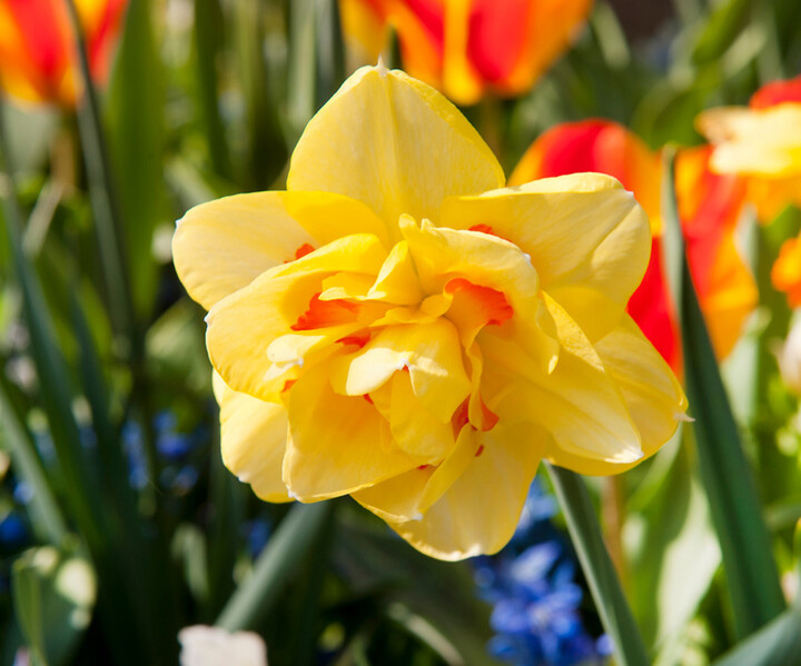 Double daffodils are hardy in USDA Zones 3-9, so you'll only need to plant the bulbs once, and they should come back each spring for decades. Like regular daffodils, they’ll grow best in rich, well-drained soil; the bulbs can rot if they’re left sitting in water, so good drainage is a must. The plants also need full sun to flower, so make sure you’re growing them in a spot where they’ll get at least six hours of direct sunlight every day. Usually, double varieties will bloom in mid- to late spring, a little later than regular daffodils.