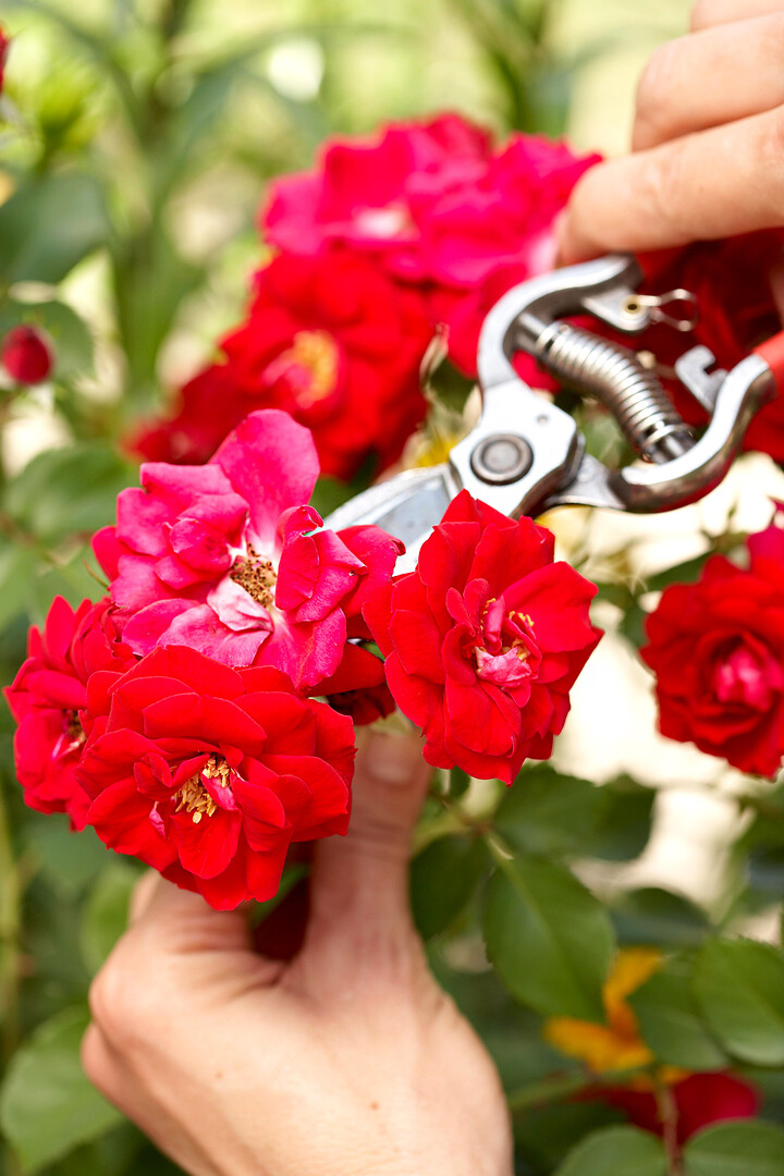 Removing faded flowers encourages new blooms and maintains a clean look. Because most roses repeat bloom from spring until late fall, keeping up with deadheading can be a chore. One way I get this done is by twisting off old flowers with my hand each time I walk by (slipping on a garden glove first helps protect against scratches). If a rose flowers so densely that removing each bloom would take forever, clip the whole plant back a few inches with hedge shears. In a couple of weeks, new flower buds will appear.