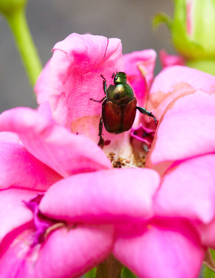 Many roses attract butterflies, bees, and other beneficial wildlife. Of the insects that feed on roses, most do little enough damage that it's not worth treating for them because you'll often harm the pollinators, too. If the damage gets out of control, try using less toxic organic pest control options such as insecticidal soap to take care of the problem.