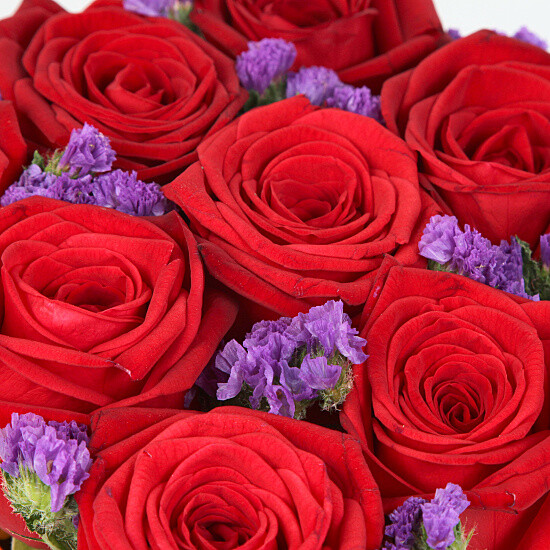 A modern twist to a traditional red rose bouquet, 9 passionate red roses embracing purple Limonium in a beautiful cube vase. £29.99 with free delivery*