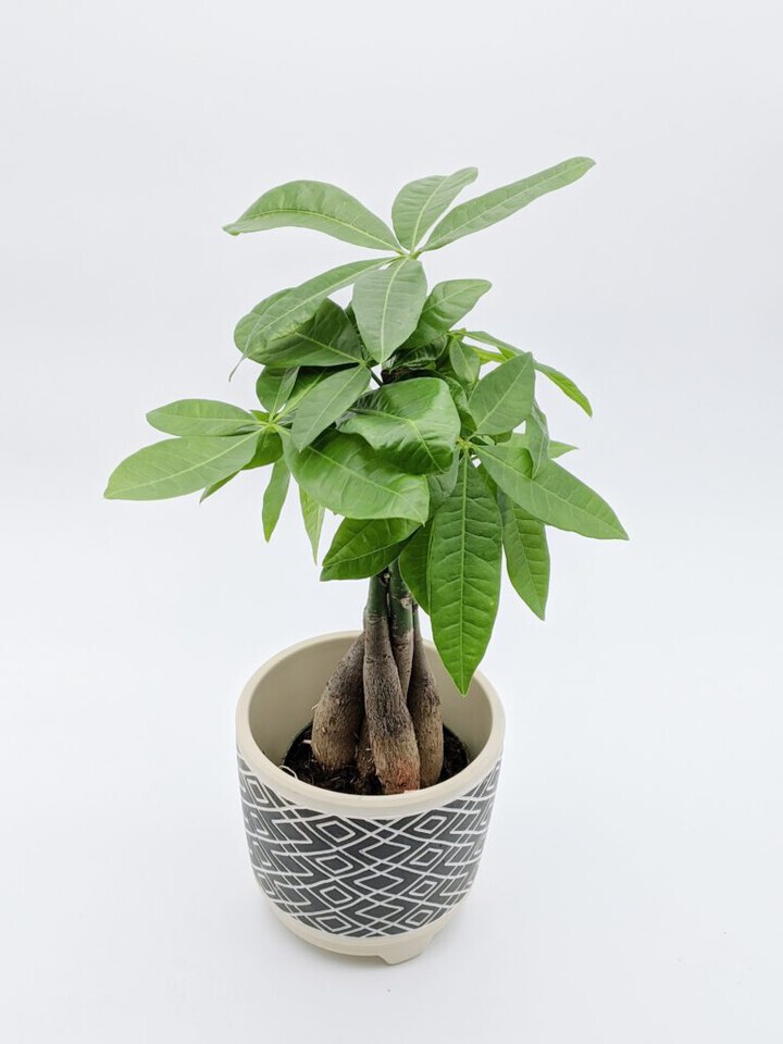To care for Money Tree, start by planting it in a well-draining pot with soil that is also well-draining, and preferably somewhat sandy. Place Money Tree in a spot that will get medium to bright indirect light, and is typically between 65 and 80 degrees Fahrenheit. Watch out for drafts, vents, and cold windows as Money Tree very much prefers a consistent environment. If Money Tree is relocated or if something in its environment changes, you’ll likely see it drop some leaves. Money Tree is pet safe and air cleaning, so combined with the ability to survive with only medium indirect sunlight, this plant has greater flexibility than many other houseplants when it comes to where it can be placed. It does, however, prefer humidity, so it might end up needing a humidifier or to be placed in a bathroom with at least medium sunlight (though Money Tree can also tolerate artificial light, so you can add light as needed.)