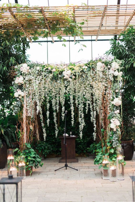 Don’t have a wall to work with? Create your own using strands of flowers, a little like a natural curtain. This is a great option for a garden party, as it will allow you to create different sections and corner off certain areas. Whereas one area could be a seating area, where you intend to serve drinks and food, another could be a stage for a band…the options are endless.