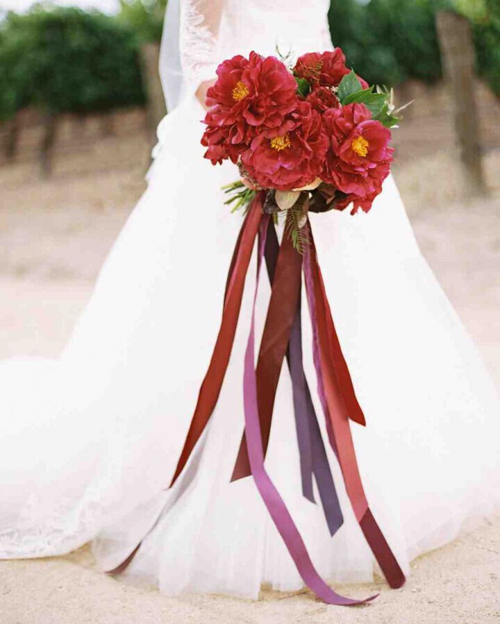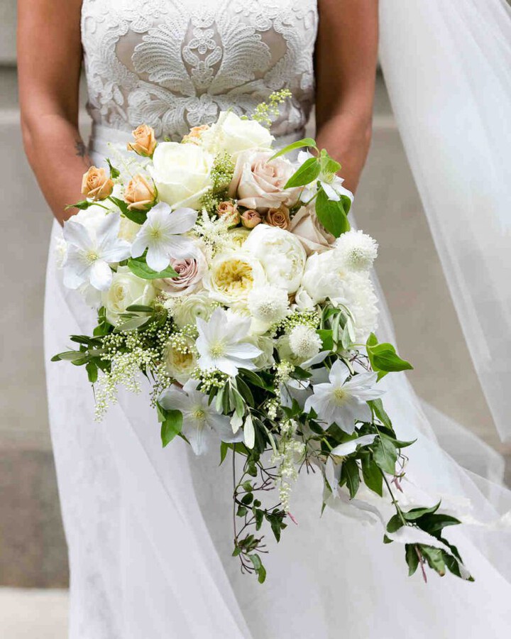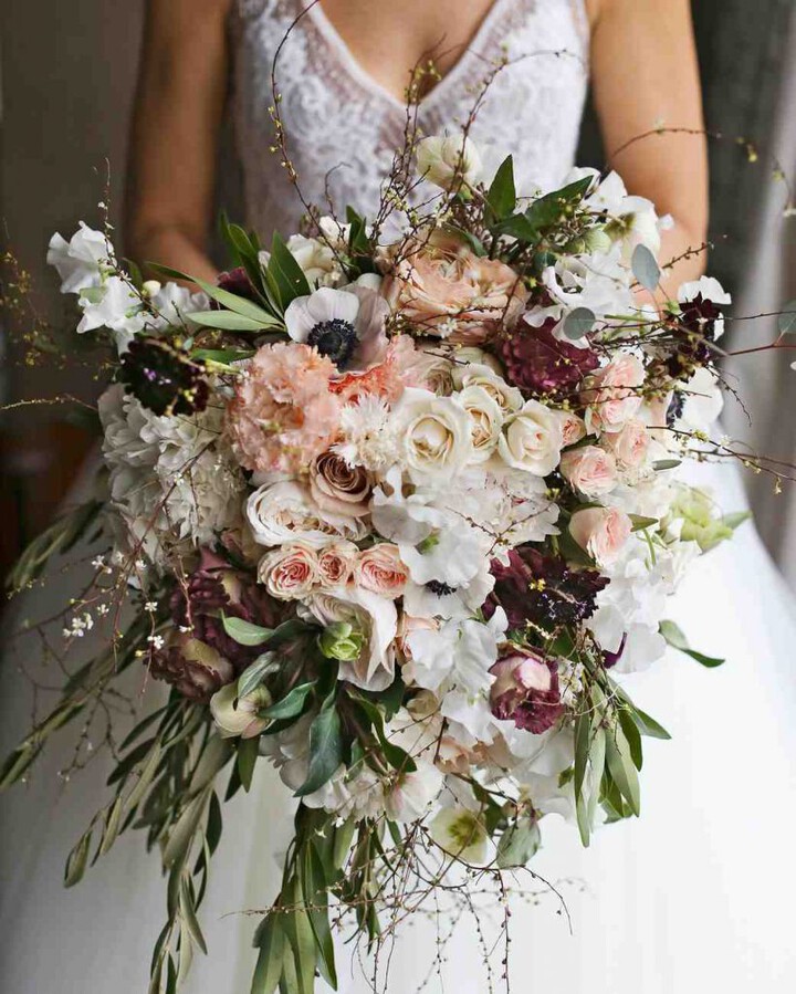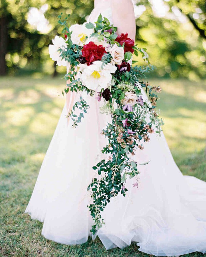 If you are looking for a peony bouquet that has that extra wow factor, look no further than a bunch of flowers brimming with blossom, roses, orchids and peonies. All complement each other and add a sophisticated, romantic touch to your wedding attire. The end result – a cascade of flowers shaped like a teardrop.