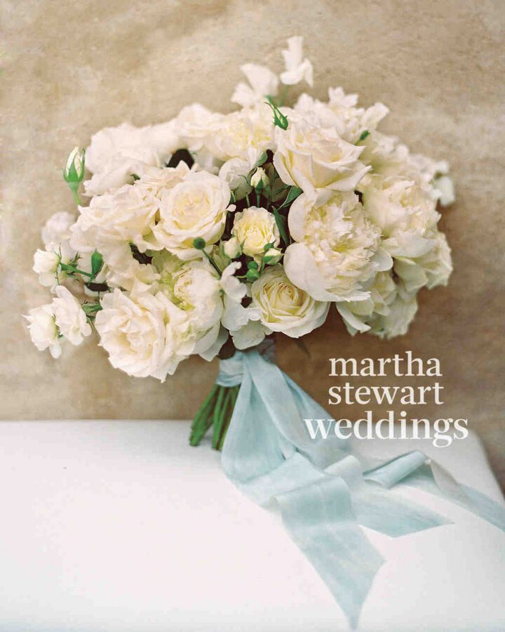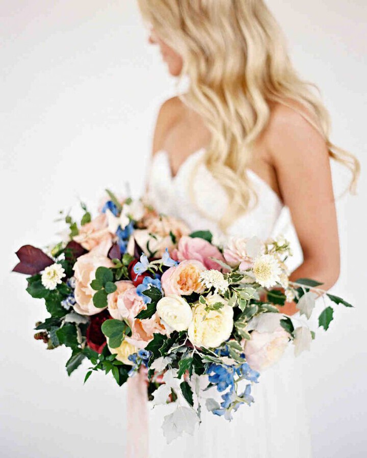 Instead of looking for something that doesn’t exist in nature, choose an array of bright white peonies and tie them together with a raw silk, powder blue ribbon. This picture perfect peony bouquet is a great option for a boho or vintage-style wedding. Alternatively, wrap a satin ribbon, some rustic string or a family handkerchief around the base of the stems.