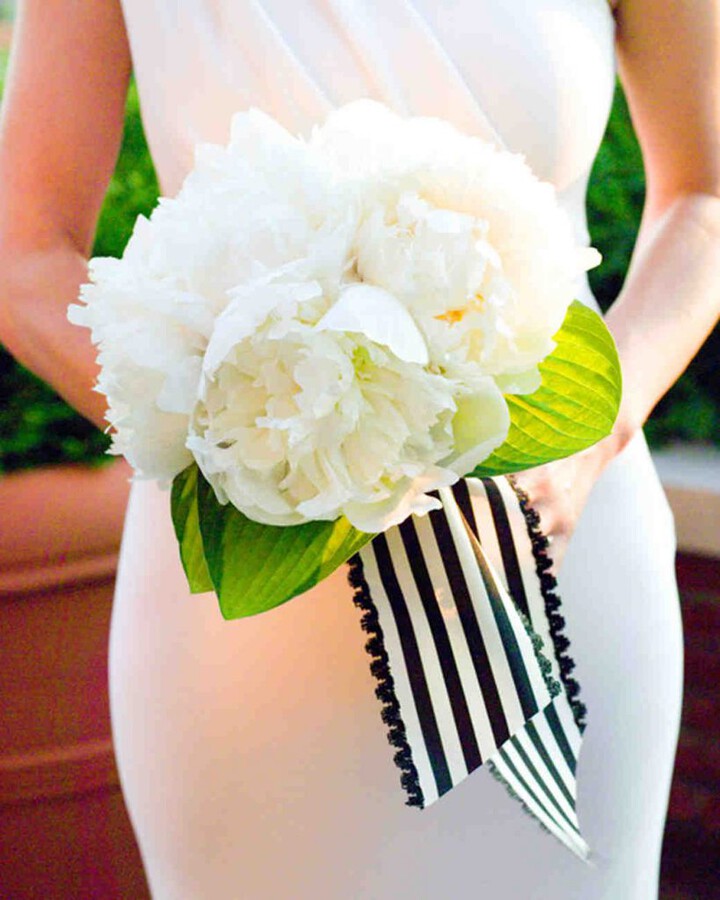 If you wish to add oomph to a bouquet of modest white peonies, simply add fresh greenery to the mix and a black and white striped ribbon for maximum impact. The brightness of the black and green perfectly complement the bright whites of the peonies and your wedding dress.