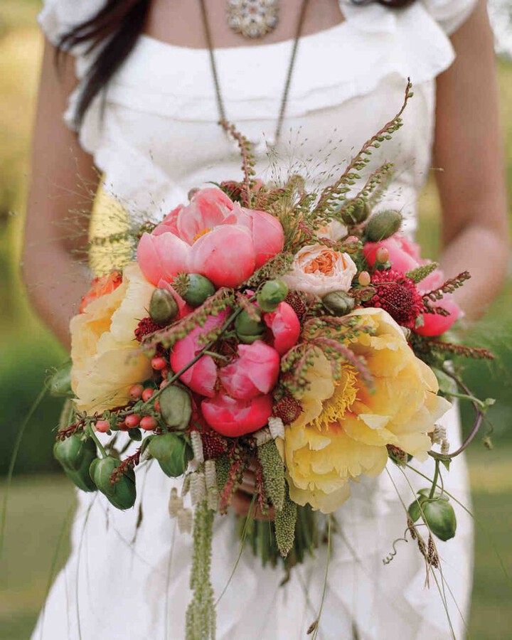 For a more rustic style, choose flowers that look as if they have just been plucked from the wild. Charm and gold peonies are offset by seeded grass heads, poppy buds and cabbage roses – the end result is a wild, loose peony bouquet, ideal for a shabby-chic style wedding.