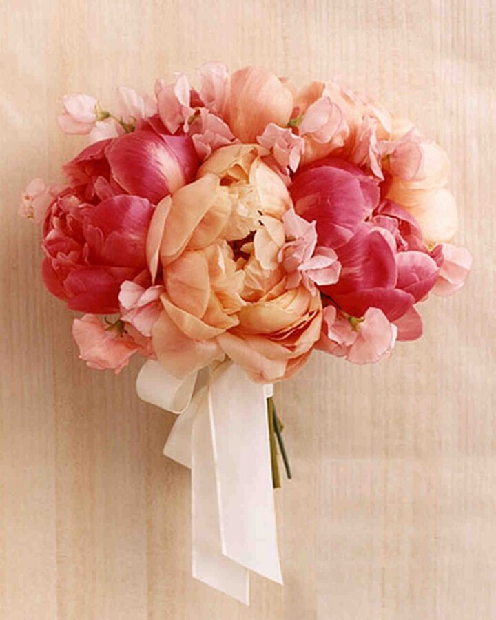 For an amazingly simple bouquet, choose giant hot hued peonies and team with ruffle sweet peas in several shades of pink and coral.