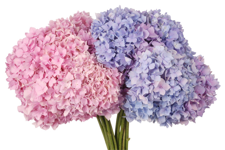 The colours all depend on where the Hydrangeas have been planted and what plant food they have been given. It is the content of aluminium in the plant that controls its colour, with pH affecting the uptake of aluminium.