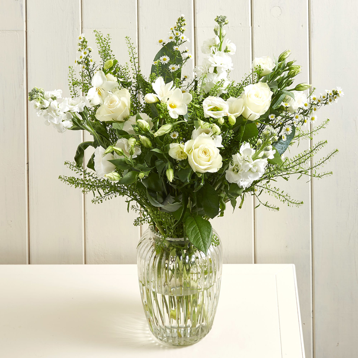 Send ultimate joy straight through the letterbox with a gorgeous array of white blooms in the shape of Freesia, Lisianthus, Asters, and Stocks.