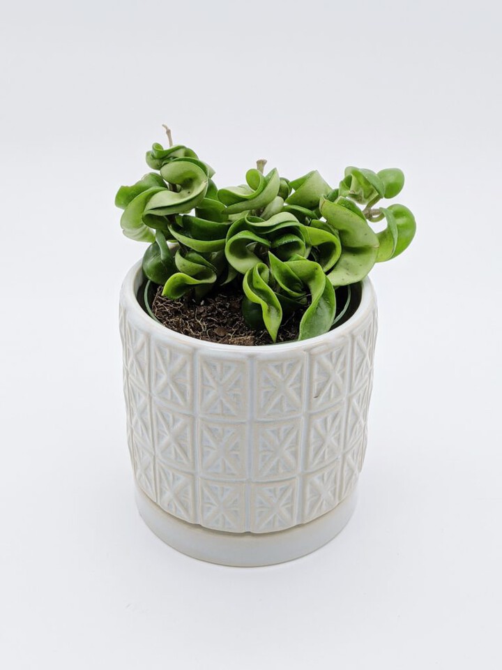 Another of its many unique and fun traits is its growth habit. Hoya Hindu Rope is a vining plant, but it will also trail. It does well in a hanging pot, or climbing up a pole, and can even be trained around strong shaped wire. This plant loves bright, indirect sunshine but will tolerate low light as well. This means that Hoya Hindu Rope will not die from lower light conditions, but you will likely not see its incredible flowers unless it’s in bright indirect light. It also does well with artificial light if you do not have a sunny spot for it.