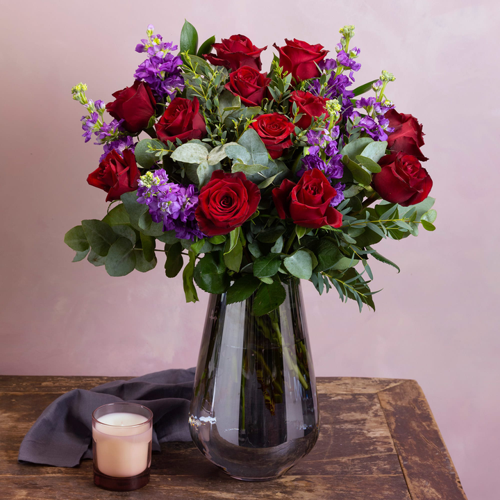 ‘My bounty is as boundless as the sea, my love as deep; the more I give to thee, the more I have, for both are infinite.’ Shakespeare’s words ring true with a Romeo and Juliet bouquet brimming with a dozen red roses and an assortment of purple Stocks enveloped by an array of Eucalyptus leaves.
