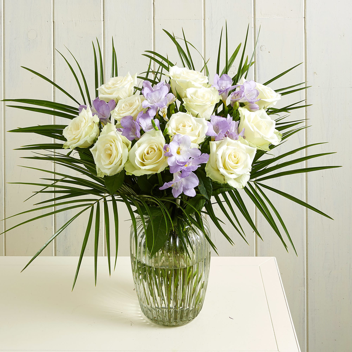 twilight bouquet will help your loved one take a moonlight stroll down shadowy lanes with a beautiful backdrop of silvery starlight. Lavender Freesia teamed with white roses make a great gift for a loved one.