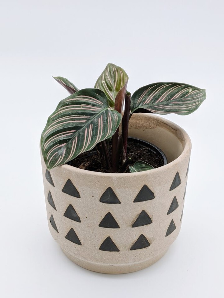 Another member of the Marantaceae family (the “Prayer Plant” family), Calathea Ornata is unique due to the pale pink and delicate pinstripes running through its dark green oval leaves (hence its nickname of “Pinstripe Plant”). Much like other Calathea plants, Ornata can be a bit finicky, so we recommend this plant be taken in by Plant Parents who have some existing experience with tropical houseplants. Calathea Ornata is native to Africa, the West Indies, Thailand, Central America, and South America. As a result, and like its cousins, Ornata prefers and needs a humid place to live. If you live in a dry climate like the one we have here in Colorado, the bathroom is a great place for Calathea plants as long as it’s well-lit. If you don’t have good light in your bathroom (or if you already have too many ferns and calathea and other humidity-loving houseplants in there), place a humidifier near the plant, or put the entire pot (including the tray) on a dish of pebbles, and keep the dish filled with water. As the water evaporates out of the dish, it will rise as humidity to help quench the plant’s thirst. You can also give the leaves a good spritz often to help combat dryness. Your Calathea Ornata will help you out by letting you know that it’s not getting enough humidity by developing brown edges around the outside of the leaves. Just carefully trim these brown edges and add some more moisture for your thirsty plant.