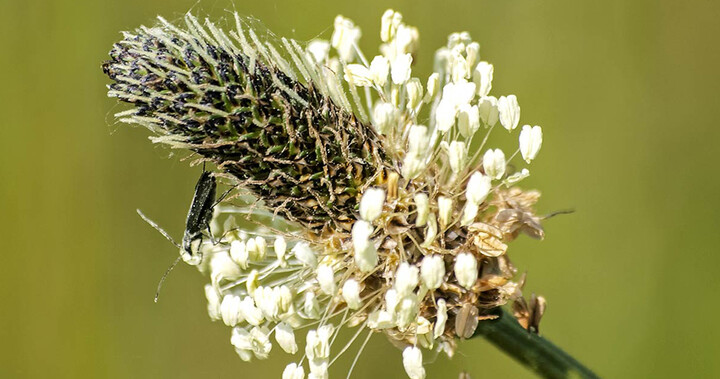 Plátano. El plátano común, también llamado plátano de hoja ancha, es una especie que a menudo preocupa a los jardineros. Puede ser reconocido en primavera por su grupo circular de hojas anchas de color verde claro que crecen desde las raíces. Picos altos y delgados crecen desde el centro del grupo. En el verano, estas espigas están cubiertas de pequeñas flores verdes. Otros plátanos incluyen el llantén de hoja estrecha, también conocido como pasto de costilla, que tiene hojas estrechas y picos cortos y gruesos; y el plátano de la playa, que tiene hojas que se usan en medicina para disminuir la inflamación. Las semillas de varios tipos de plátanos se utilizan como laxante suave.