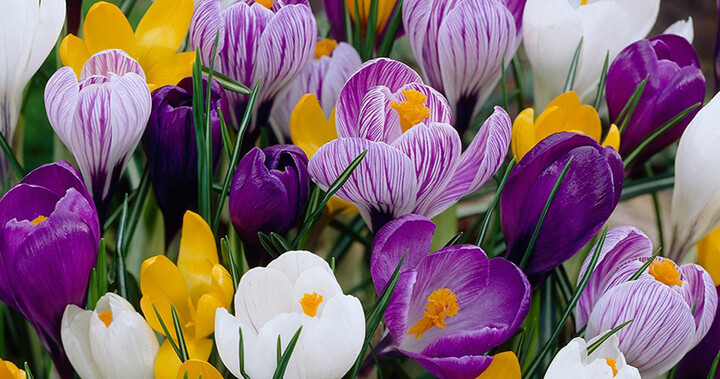 Crocus, plantas con flores que florecen en primavera o en otoño. Pertenecen a la familia del iris. Su hogar original estaba en las partes más cálidas de Europa y Asia, pero ahora se cultivan en jardines en muchas tierras.