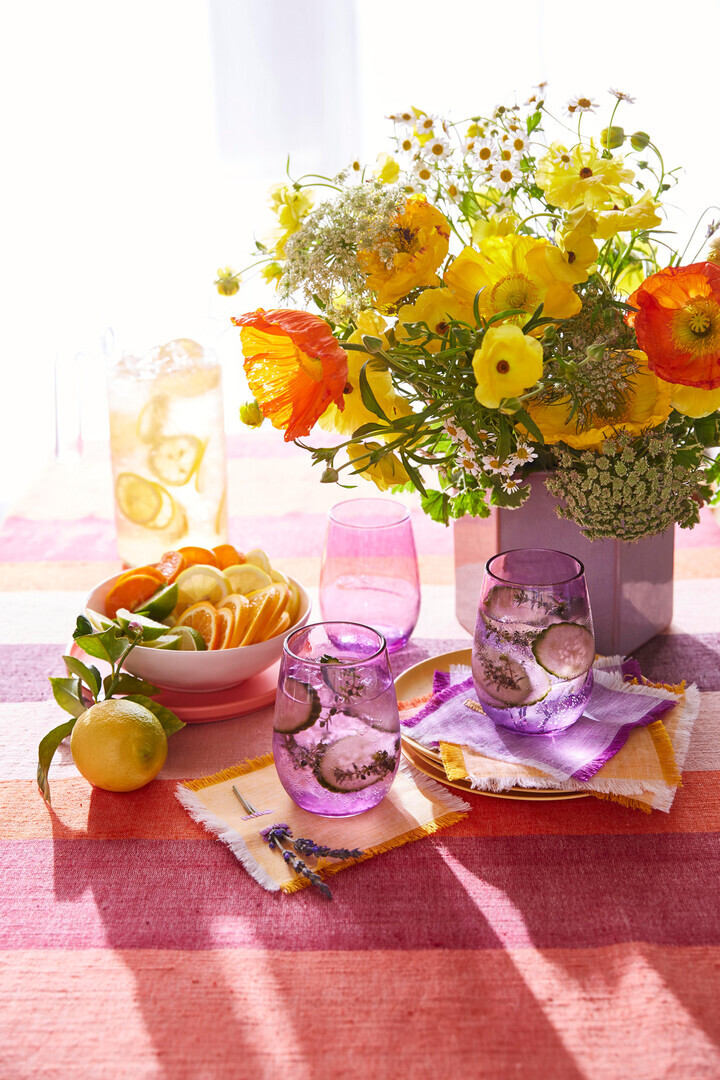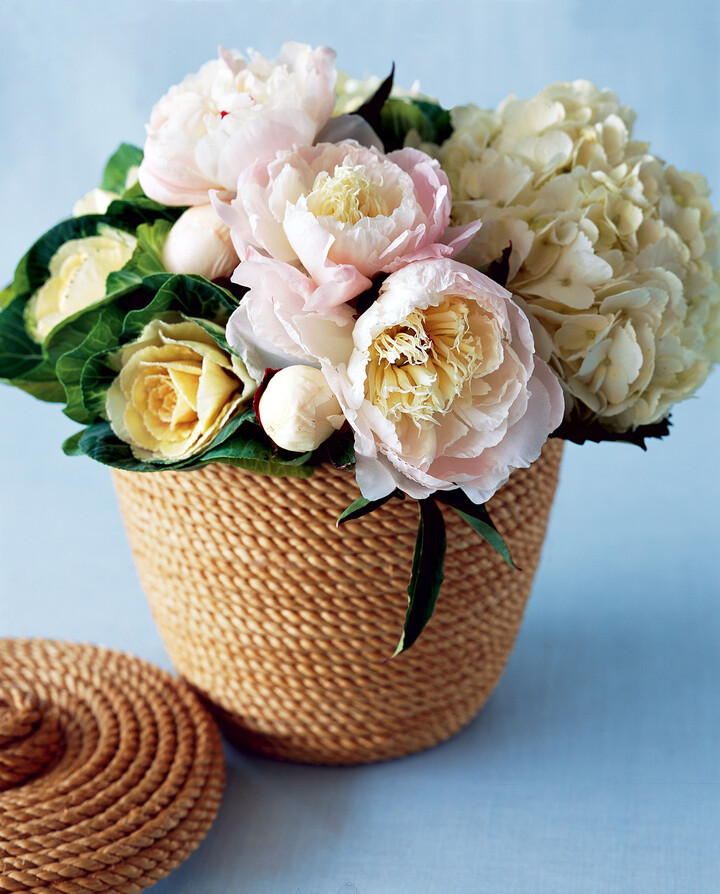 When selecting a vase or other container for your arrangement, consider the type of flowers you're using. Tulips typically require the support of a straight-sided vase, for example, while tall branches or top-heavy flowers might need a weighted vessel, Moss says. Apart from traditional vases, she likes to house flower arrangements in woven baskets for added natural texture. To hold water and keep the flowers in place, line the basket with a plastic container (shop your kitchen cabinets or repurpose plastic water bottles and other packaging). If necessary, fill in with moss around the container to disguise it inside the basket.