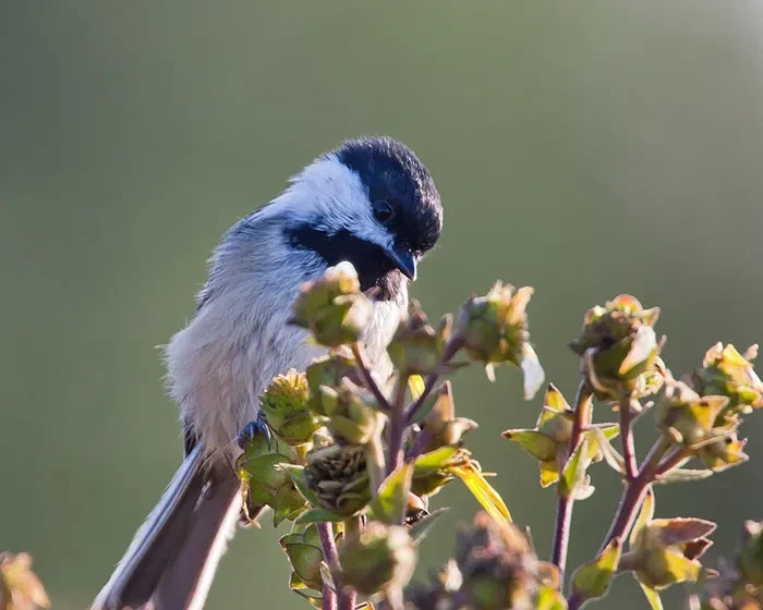 Birds with small, sharp bills, like this black-capped chickadee, are perfectly outfitted for teasing out the fine seeds of perennials and annuals.