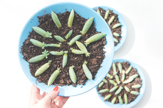 Lay your fresh leaves horizontally on some soil. For my current "mass production project" I used some plates with a thin layer of soil, but you can also lay them on the foot of a plant in a plant pot. My succulents also grow without soil (I sometimes find babies randomly in our home!), but appear to grow faster and stronger with it.