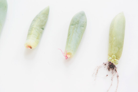 After a few weeks some miniature white or pink roots will sprout from the tip of your leaves. And a teeny tiny baby plant will start to grow. Oh how I love their cute pink roots: