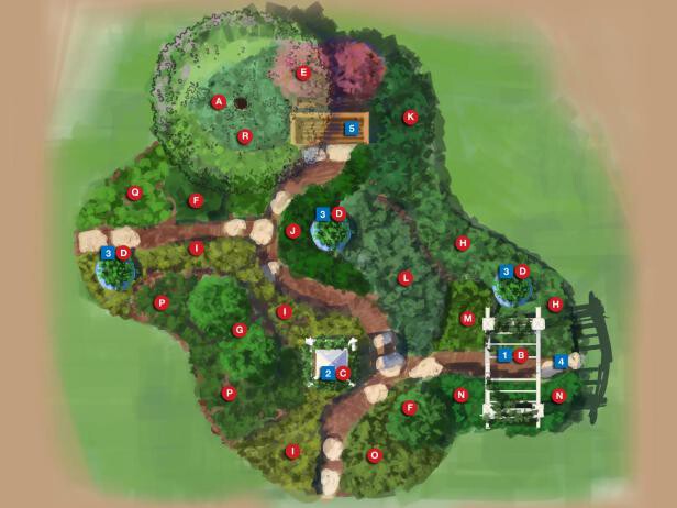 Enter this garden of hues through the vine-draped arbor or by way of two other stepping stone walkways that wind past pots of annual color. The bench with a commanding view of the numerous spreading, mounding and cascading blooms is sheltered by a flowering tree. While the overhead canopy provides summer shade, a cluster of shrubs behind the bench provides enclosure. A vine clambers over a tuteur to provide a vertical architectural focal point.