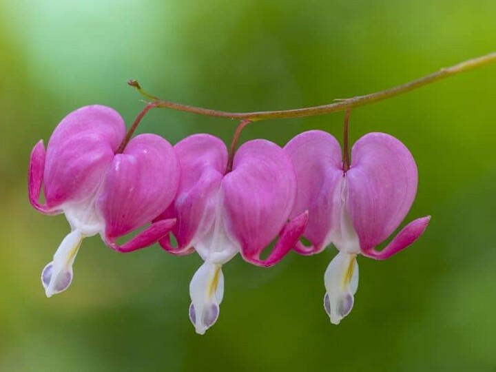 Bleeding hearts (also known as Lamprocapnos spectabilis and Asian bleeding-heart) are unlike most other flowers growing around your home. The flowers are heart-shaped with a small trail of color that falls just below the bloom itself. These flowers are generally pink in color—similar to an actual heart—but can also be found in white.