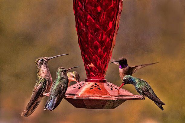 Because hummingbirds are territorial, it’s also best to place several feeders throughout your garden. Avoid using feeders with yellow bee guards because they actually may draw bees, and add an ant moat to prevent them from swarming your feeder. Hummingbirds won't come if ants are clogging up the feeders. Remove feeders in the fall about two weeks after you see the last hummingbird.