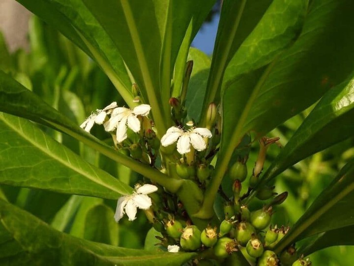 These uniquely-shaped flowers with a scientific name scaevola taccada are entrenched in local legend. Supposedly, Naupaka, a princess, fell deeply in love with a commoner. She was directed to a temple far away, where she should pray for advice on what to do. Naupaka and her lover traveled for days, but on their arrival, were told that nothing could be done.
