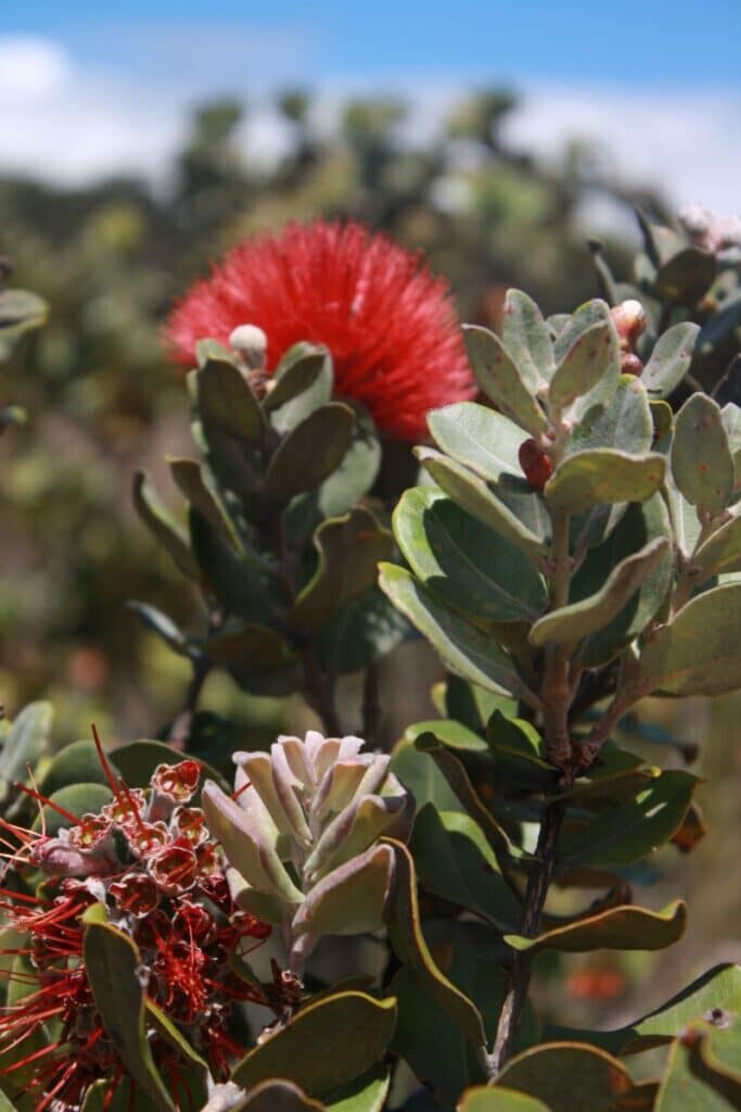 Ohia lehua flowers (Metrosideros polymorpha) are often viewed as symbolic of Pele, the goddess of volcanoes. This is because these flowers were some of the first to begin growing on lava flows after an eruption.