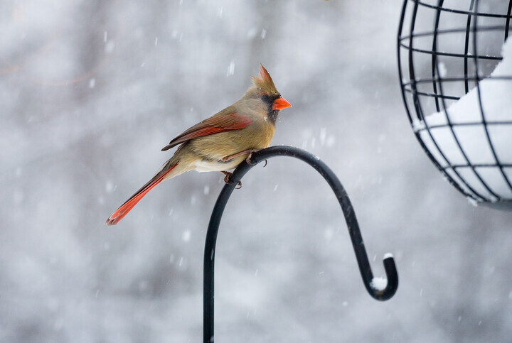 A word of caution: cardinals are relatively slow fliers because of their larger bodies and short, rounded wings. When they're on the ground picking up fallen seeds from feeders, they make easy prey for cats so it's best to keep your felines indoors. And try to locate feeders away from shrubs and other vegetation where cats and other predators could hide.