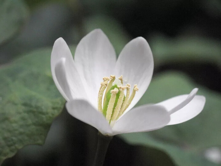 The fragile flowers are white and they bloom in March or April and only last a few days. On each leafless stalk, a single cup-shaped flower blooms as three- to five-inch leaves emerge. The common name twinleaf is inspired by the identical lobes of the leaf, shaped like angel wings at the top of the stems.