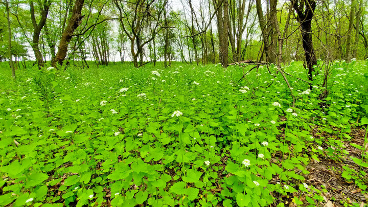 What makes garlic mustard so invasive is that a single plant produces between 600 and 7,500 seeds, and that the seeds can survive in the soil for up to five years.