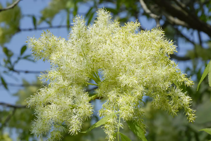 Manna ash is named after the food described in the Bible because of its sweet sap extract. The sugar alcohol mannitol and the sugar mannose can be taken from this sap. This has one of the prettiest flower shows of the ashes, appearing in May; its other common name is flowering ash. The dark-gray bark on this tree remains smooth, even in old trees. The leaves form in bundles of five to nine leaflets, with finely serrated edges, turning yellow-purple in fall.