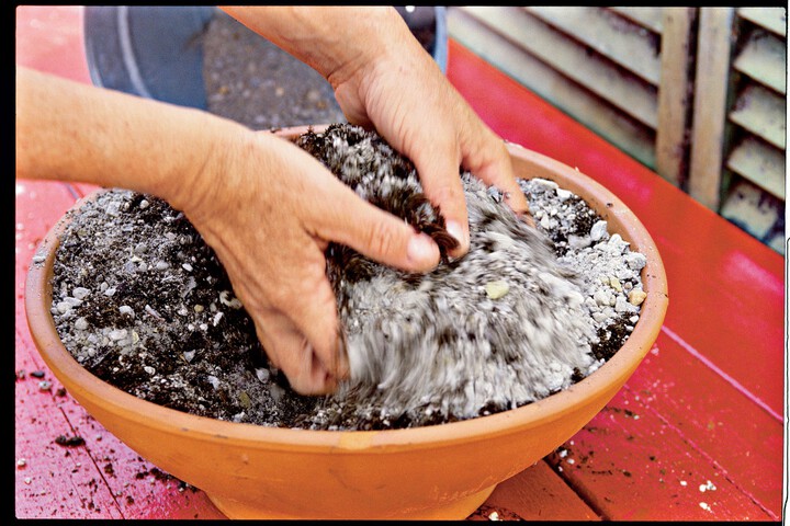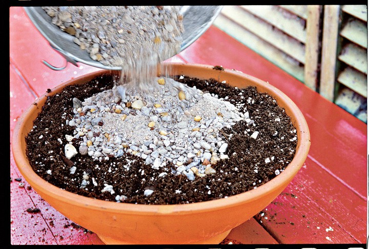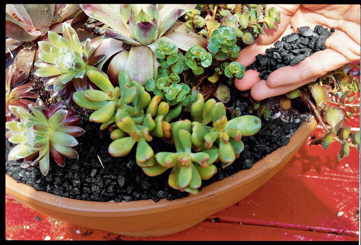 Sprinkle dark-colored aquarium gravel around each plant so that the soil is covered.