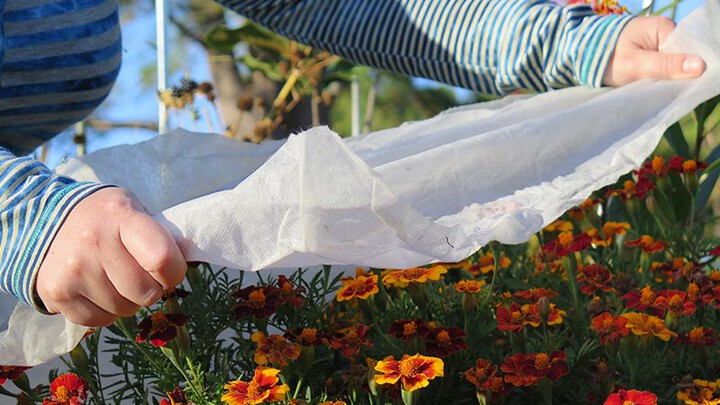 Burlap, bedsheets and bath towels will serve if you don’t have row covers, but you’ll have to be careful or they might crush your plants. You can leave your row cover, which is very lightweight, in place for several days if necessary. If you use other household textiles, check your plants every day and remove the covers during the day if possible.