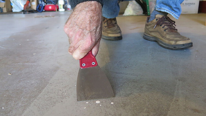 For tough paint stains, you may need a commercial paint stripper. This solution should stay on the stain for several hours before scraping or scrubbing the concrete. Wear gloves and make sure the garage is well ventilated.