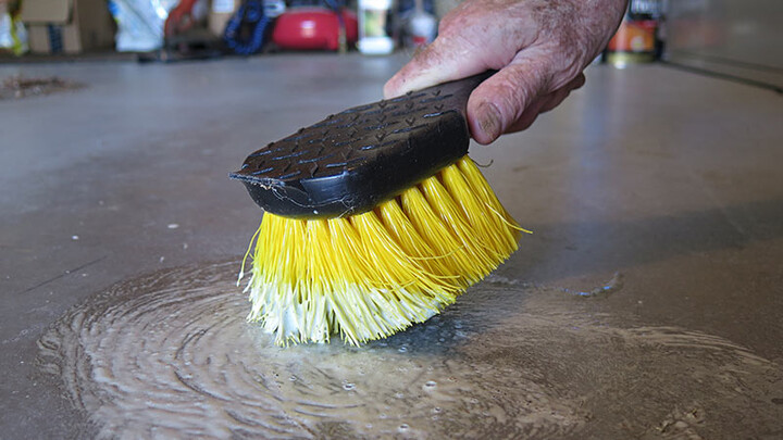 Once you’re done sweeping, pour dry dish soap or laundry detergent onto the stain. Let it sit for 45 minutes. Next pour water on the area and scrub with a nylon-bristle brush, which will not scratch the surface of the concrete. Allow the soap to sit for 10-15 minutes and scrub again. After scrubbing, rinse with a power jet wand, diluting and directing the soapy water out of the garage.