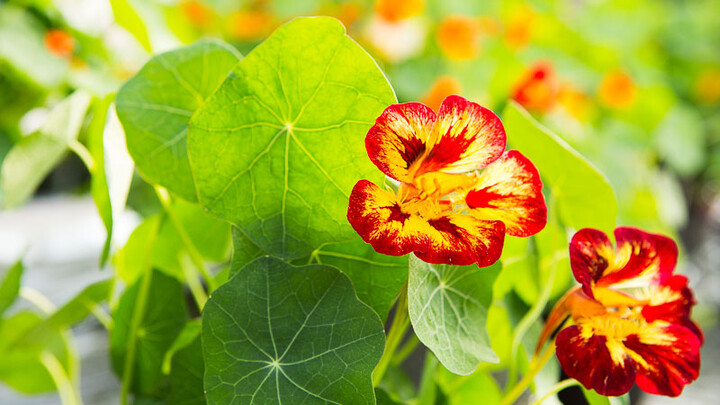 Multi-purpose nasturtiums can be grown for their charming foliage and flowers, that serve as food, or to lure aphids away from your veggie garden. Toss its leaves and blossoms into a summer salad or pickle the seeds to make “poor man’s” capers. Grow nasturtium in a patio garden, flower garden, or kitchen garden. It tumbles out of containers and along garden walks thanks to its vine-like nature. Be sure to give it good soil and regular water.