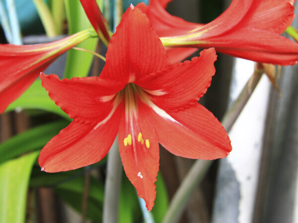 When in full bloom, the plant can be moved to lower light to prolong its flowering period. Turn the pot occasionally when in bloom to correct any leaning. Often, the heavy flowers born on the end of long, tubular stalks need to be staked. Each bulb will produce two flower stalks over-lapping in succession. The flowers are each about as big as a hand. Each stalk will have four flowers, so each plant will have eight blooms. Be sure to remove the spent and faded flowers (the droopy petals of the more vibrant colorings will stain skin and clothing). After the flowers are finished, cut the stalk off at the base.