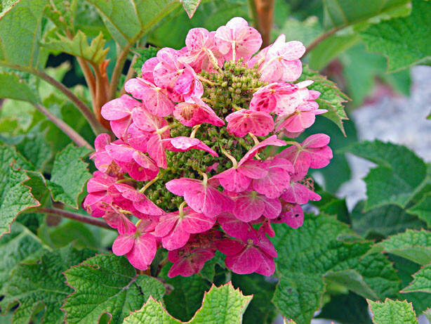Smaller size Standard oakleaf hydrangeas reach 8–10 feet tall, but ‘Ruby Slippers' oakleaf hydrangea, developed by the U.S. National Arboretum, reaches just 31⁄2 feet. Flowers turn from white to deep pink, and foliage goes crimson in fall. Monrovia (monrovia.com).