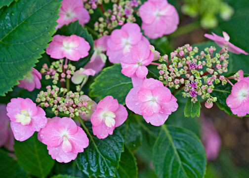 Bloomin' tough Hardy Tuff Stuff reblooming mountain hydrangea flowers on new and old stems for steady blooms all season long. The pink lacecap flowers may look blue in acidic soils and will darken through the growing season. Proven Winners (provenwinners.com).