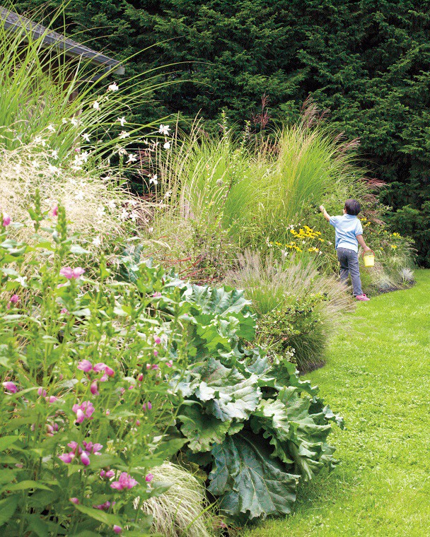 With so many varieties of ornamental grasses to choose from, small to medium sized grasses-such as needle grasses (Stipa ssp.) or sedges (Carex spp.)-can be mixed with perennials and annuals for a dramatic or naturalistic feel. Also, most ornamental grasses can be blended into different garden themes like cottage, seaside, Asian, modern, and even drought tolerant. Pro tip: Before purchasing your grass, read the plant label carefully to determine if your choice needs little or lots of water, as well as what sort of exposure it prefers.