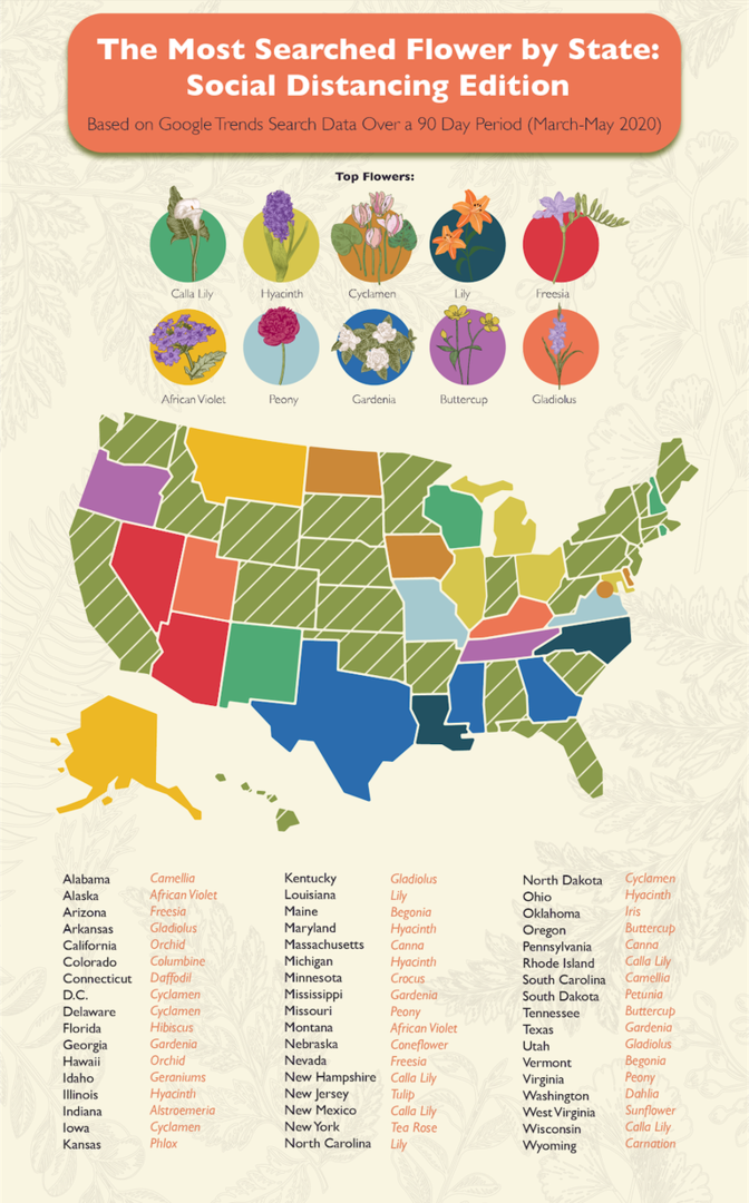 The researchers with the company also discovered the flowers people searched for most over a one-year timeframe. Sunflowers, hyacinth, camellias, tiger lilies, and cyclamen trended most from May 2019 to May 2020.