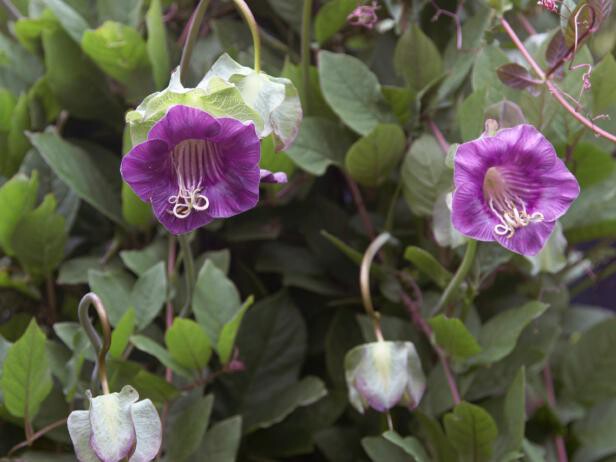 Cup-and-saucer vine — also called cathedral bells or monastery bells (Cobaea scandens). If you sit in your garden nonstop for a few days, you can watch an interesting metamorphosis take place in this Victorian-age favorite. Green buds unfurl to produce pale green saucers (the calyzes), followed by green cups (flowers); the combo then gradually turns striped lavender, followed by violet-purple. Later dark green fruits appear. Cup-and-saucer vine has clinging tendrils and needs only a rough wall, on which it can easily reach 20 feet. Start early, indoors in peat pots; flowering takes almost four months.