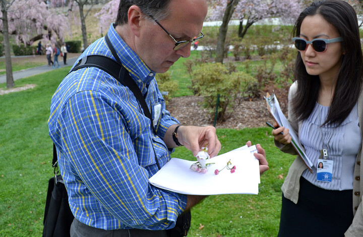 Aiello has been working to help ensure that different collections around the country are using a common set of names—he tries to visit a few each spring. This year he’s also been to Washington, DC, to examine the National Arboretum's cherry trees. (Being a traveling cherry cultivar expert is a pretty sweet gig, he admits.) He’s planning one more visit to BBG this week, now that the late-flowering cultivars have blossomed. So far, he’s found the collection to be in pretty good order, but some updates will likely be made to the Garden’s records, plant labels, and Cherry Watch.
