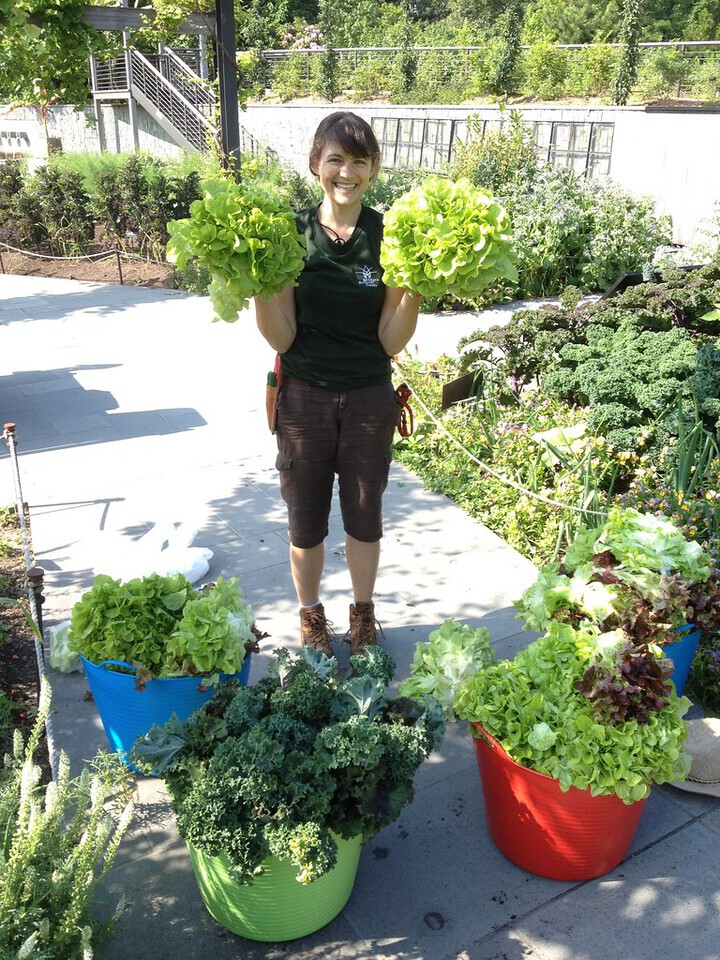 Melanie Rose Wilson, a horticulture intern at BBG, has been harvesting greens and other produce in the Herb Garden this summer. It is then delivered to a local church food pantry.