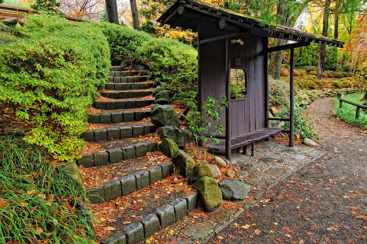 This idealized landscape was created in the Japanese tradition of shizen—the art of making a garden look as though it has grown that way on its own. Other vistas are gradually revealed as you walk along the garden’s winding paths, including a five-tiered waterfall that you hear before you see as you round a bend. Farther on, a small rustic Shinto shrine sits on a steep hill.